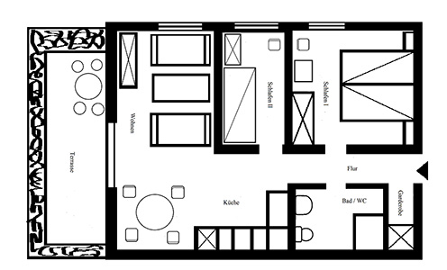 Ca. 50 qm, bis 3 Personen und Kleinkind, komplett eingerichtete Küchenzeile, gemütliches Wohn-/Esszimmer mit Kabel-TV und Radio, freundliches Bad mit Dusche/WC, 2 Schlafzimmer, Kinderbett und Hochstuhl, Terrasse.